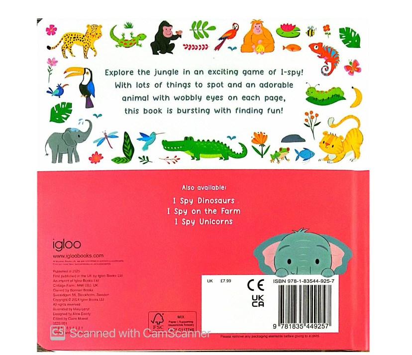 With its playful wobbly-eyed characters on the cover and every spread, this exciting search-and-find book is designed to capture attention and spark curiosity. I Spy in the Jungle takes young explorers deep into a vibrant world teeming with hidden surprises, cheeky animals, and lush scenery. Bursting with colour and adventure, this book offers endless fun as little ones search for cleverly concealed objects on every page. Perfect for curious minds, it promises a wild and engaging journey through the jungle, making it an irresistible addition to any bookshelf.